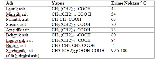 Doymuş yağ asitleri yapısı ve erime noktaları (Bingöl, 1976; Levene ve ark., 1928)