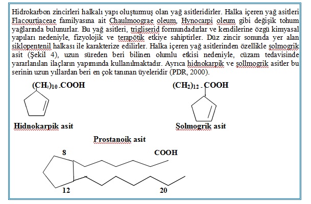 Şolmogrik asit 18 karbon atomlu siklik bir yağ asitidir (Şekil 4). Eskiden lepranın tedavisi için kullanılmıştır (Bingöl, 1976).