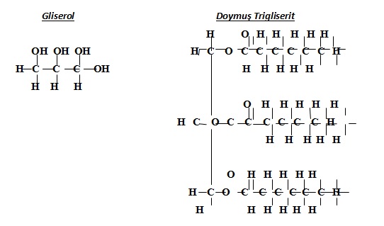 Trigliseritler nötr yağ olarak da adlandırılır. Doğada lipitlerin en çok bulunan şeklidir. İçerdikleri karbon miktarı oksijene göre daha fazla olduğundan lipitler vücutta parçalandıkları zaman karbonhidrat ve proteinlere göre daha fazla enerji verir. Lipitlerin parçalanması için daha çok oksijene ihtiyaç vardır. Hayvanlarda depo edilen lipit çeşididir. Trigliseritler bir gliserol molekülü ile üç molekül yağ asidinin ester bağlarıyla bağlanması sonucu oluşur. Gliserol ile yağ asitleri arasında üç ester bağı kurulur. Doymuş, doymamış yağlar ve mumlar bu gruba girer (Şekil 5).