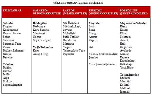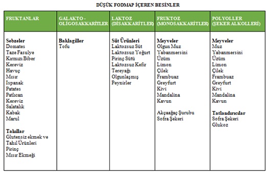 FODMAP’in açılımı Fermente edilebilen Oligosakkaritler, Disakkaritler, Monosakkaritler ve Polioller’dir. Bu diyet, bağırsak hassasiyeti yaşayan ve Irritabl Bağırsak Sendromulu (IBS) kişiler için bir tedavi yöntemidir. Irritabl bağırsak sendromu; klinik olarak bir patoloji olmaksızın, bağırsak alışkanlıklarında değişiklik (konstipasyon/diyare), karın ağrısı, gaz, şişkinlik, gibi semptomlar ile karakterize bir fonksiyonel bağırsak hastalığıdır. FODMAP bütün kısa zincirli karbonhidratları içermektedir. Bu karbonhidratların zayıf düzeyde emilip bağırsakta hızlı fermente olduğu için semptomları arttırıldığı düşünülmektedir. Tüm karbonhidrat tüketenler bu problemi yaşamamakta fakat IBS hastalarında bu duyarlılık fazladır. Bu hastalara düşük FODMAP içeren diyetlerin uygulanması ile gastrointestinal semptomlarda azalma gözlemlenmiştir. Yüksek FODMAP içeren besinlerin tüketimi IBS’ye neden olmamaktadır. Aşağıdaki tablolarda yüksek FODMAP ve düşük FODMAP içeren besinler gösterilmiştir.