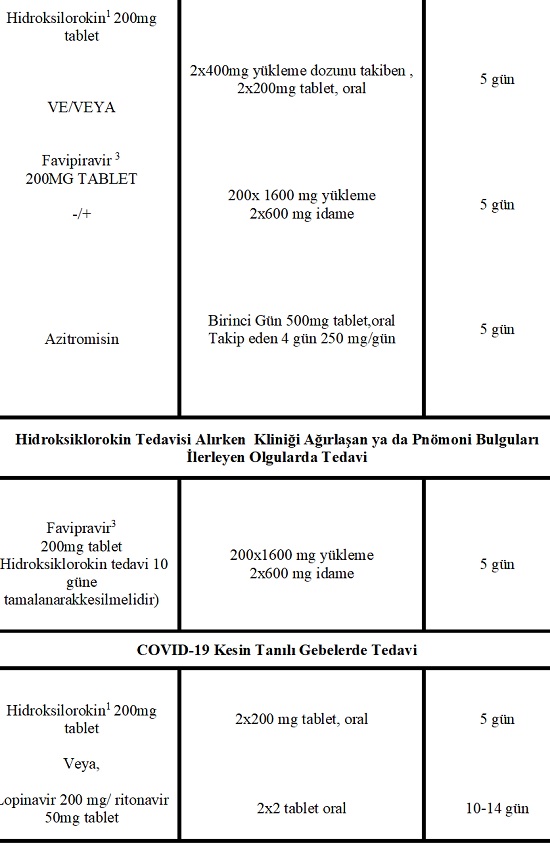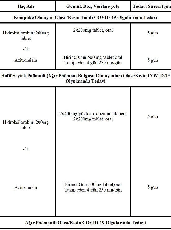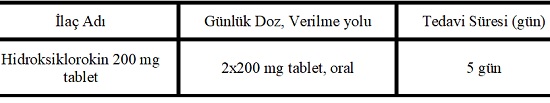 Covid-19’un Dünya Sağlık Örgütü (DSÖ) tarafından küresel bir salgın olarak ilan edilmesiyle birlikte enfekte olmuş popülasyononun artan sayısı ve ölüm sayısı ile COVID-19’a karşı küresel bir endişe gelişmiştir. Yeni bir ilaç geliştirmenin uzun bir zaman alacağı ve pandemiye karşı acil tedavi belirlenmesi gerekliliği sağlık otoritelerini var olan ilaçları tedavide kullanmaya yöneltmiştir. Etkinlik konusunda yeterli veri olmamasına rağmen, Hidroksiklorokin (HCQ) ve HCQ + Azitromisin COVID-19 için tedavi kombinasyonu olarak FDA tarafından acil kullanım izni almıştır. Hidroksiklorokin ve klorokin, SARS-CoV -2-enfeksiyonunun maruziyet öncesi ve maruziyet sonrası profilaksisi ve hafif, orta ve şiddetli COVID-19’lu hastaların tedavisi için klinik çalışmalarda araştırılmaktadır. Ülkemizde HCQ ile COVID-19 tedavisi aşağıdaki tablolarda görüldüğü şekilde yürütülmektedir (14 NİSAN 2020 SAĞLIK BAKANLIĞI COVID-19 SARS-CoV-2-ENFEKSİYONU REHBERİ).