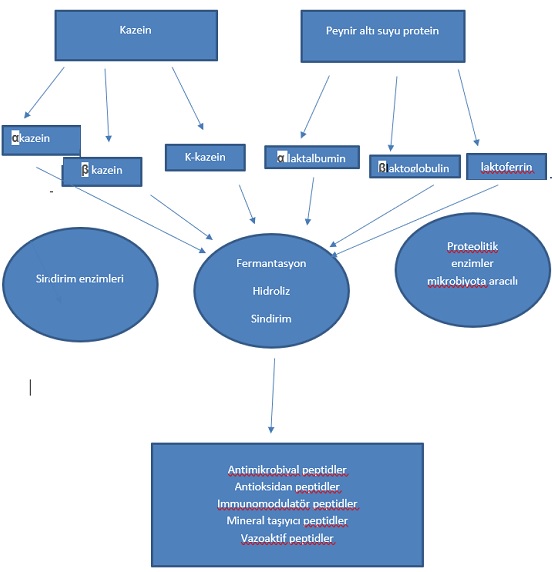 Genel olarak sütün başlıca protein fraksiyonları; kazeinler, α-laktalbumin, β-laktoglobulin, immünoglobulinler, laktoferrin, proteoz-peptit fraksiyonları (ısıya stabil, asitte çözünebilen fosfoglikoproteinler) ve minör peyniraltı suyu proteinleri olan transferrin ve serum albuminidir. Bu proteinlerden biyoaktif peptitler gastrointestinal proses sırasında açığa çıkabilmektedir. Genellikle bu peptitler hormon benzeri özellikleri ile çeşitli fizyolojik etkilere sahiptirler.