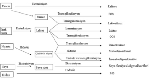 Disakkaritlerden enzimatik ve kimyasal sentezle (sukrozdan fruktooligosakkarit, laktozdan transgalaktosilikatlanmış oligosakkarit veya galaktooligosakkarit)