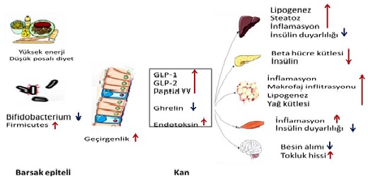 Bağırsaktaki flora üzerinde asıl rol beslenmeye düşmektedir. Diyette doymuş yağ asitlerinin fazla olması enterik Gr- bakteri kaynaklı lipopolisakkaritler (LPS) hedef dokular olan endotel hücre, monosit ve makrofajlar üzerinden toll like reseptör 4’ e bağlanır. NFkB (nekroz faktör kappa B) ve AP-1 (aktivatör protein-1) aktif hale gelir.