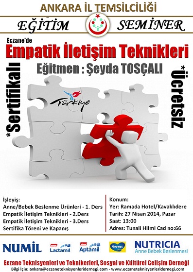 Meslek içi sürekli gelişim eğitim programlarımızı ANKARA’da gerçekleştireceğiz. Derneğimiz ve Nutricia işbirliği ile Anne ve Bebek Beslenmesinde Danışman Eczane – Empatik İletişim Teknikleri Eğitim Programına davet ediyoruz. T.C. Kültür ve Turizm Bakanlığı onaylı belge verilecektir. Eğitime katılabilmek için aşağıda bulunan forma kayıt yapmanız gerekmektedir. Kontenjan 100 Kişi ile sınırlıdır.