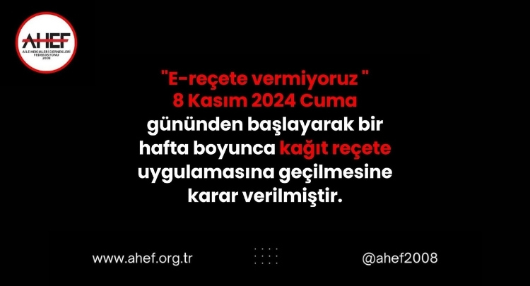 Aile Hekimleri Dernekleri Federasyonu (AHEF), üyelerinin, 8 Kasım 2024 tarihinden başlayarak bir hafta boyunca, e- reçete vermeyerek kağıt reçete uygulaması yapacaklarını resmi sosyal medya hesaplarından duyurdu.