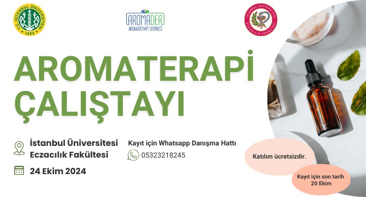 İstanbul Üniversitesi Eczacılık Fakültesi'nde 24.10.2024 tarihinde Aromaterapi Çalıştayı'na ücretsiz olarak davetlisiniz. Son kayıt tarihi 20.10.2024'tür.