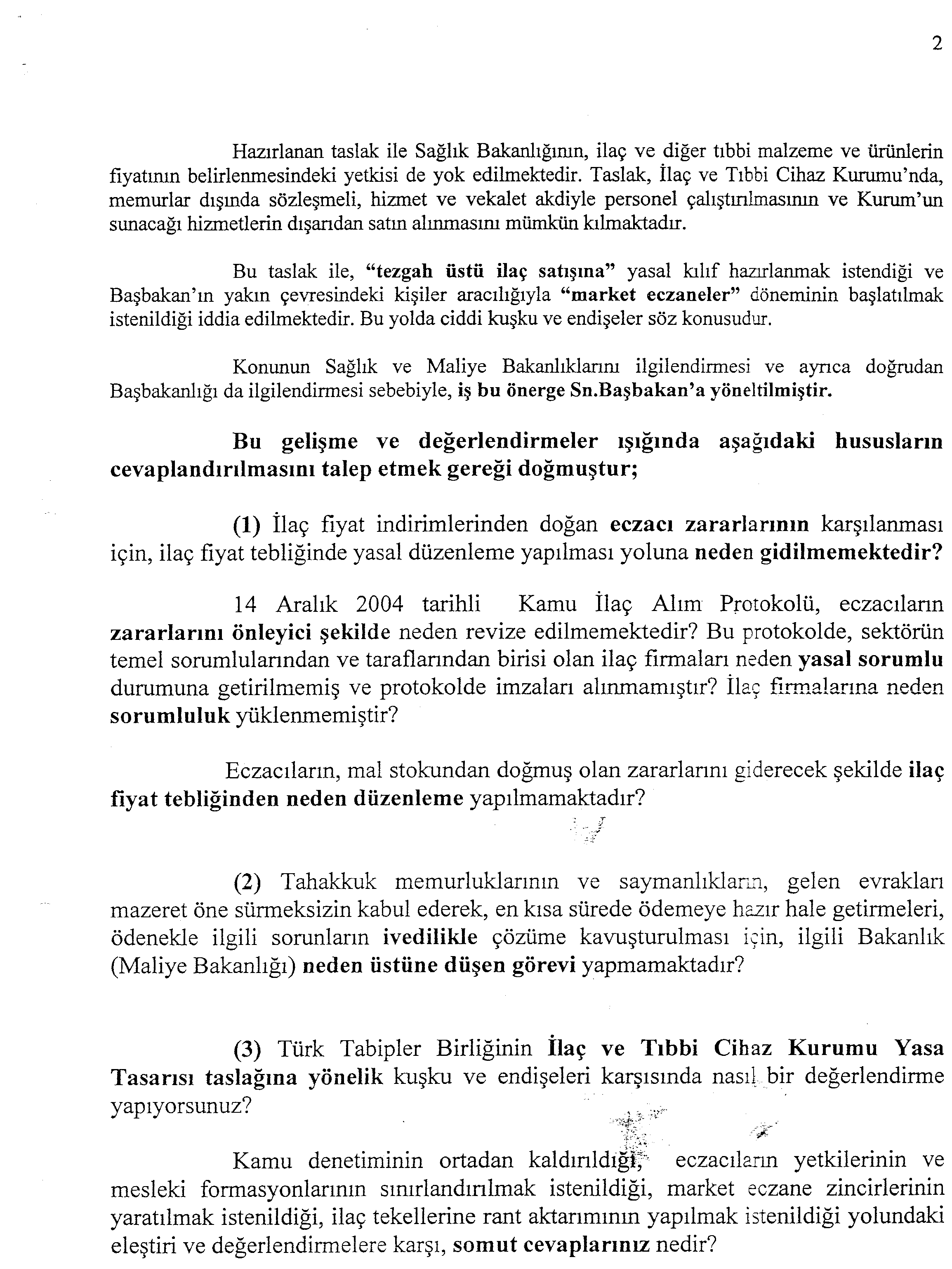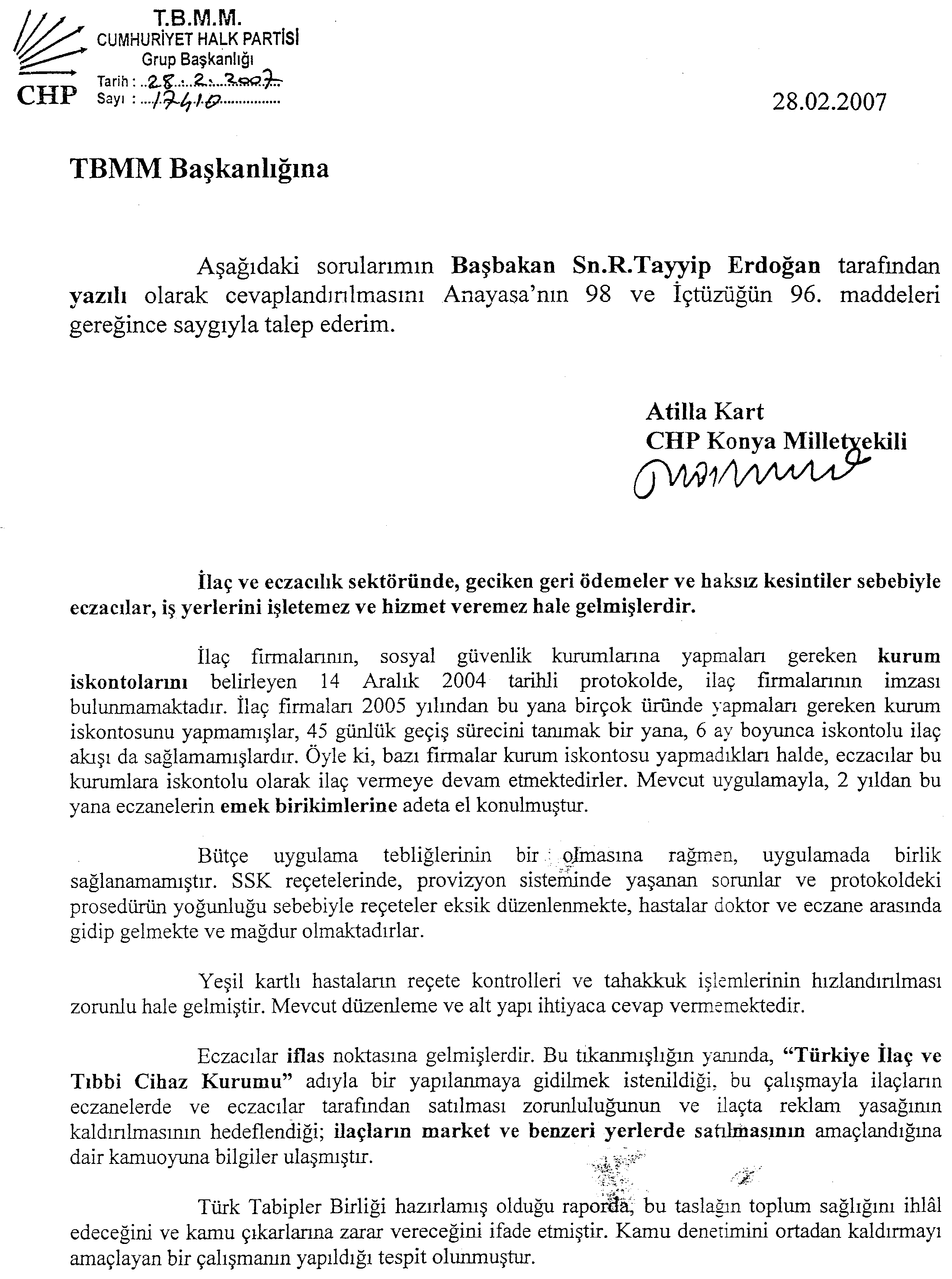 CHP milletvekillerinin, eczacılık mesleğinin sorunlarının belirlenmesi amacıyla hazırladıkları meclis araştırma önergesi, TBMM Başkanlığına sunuldu. Önergenin gerekçesinde, ilaç alımlarında kamu kurumlarının, belirlenen sürelerde ödeme yapmamalarının eczacıların fınansal sıkıntı yaşamasına yol açtığını ifade edilerek, "SSK'nın reçetelerin bir kısmını kontrol ettikten sonra eczacıya geri göndermemesi veya reçete kesintisinin nedenini bildirmemesi, önemli bir sıkıntıya neden olmaktadır" denildi. Tedavi Yardımı Tebliği ile reçete yazımı ve geri ödeme koşullarının bir çok formalite gerektirir şekilde yapıldığı belirtilen gerekçede, bir çok ilacın uzman hekim tarafından yazılma koşulu getirilmesinin hastaları zor durumda bıraktığı savunuldu. Gerekçede, reçete kontrollerinin standart olmamasının eczacıların aleyhine olduğu ileri sürülerek, orijinal ilaç üretimi için AR-GE altyapısının geliştirilmesi istendi. Kamuda çalışan eczacıların sorunlarının da gündeme getirildiği gerekçede, çeşidi kurumlarda görevli eczacılar arasında ücret eşitsizliğinin hala devam ettiği kaydedildi.