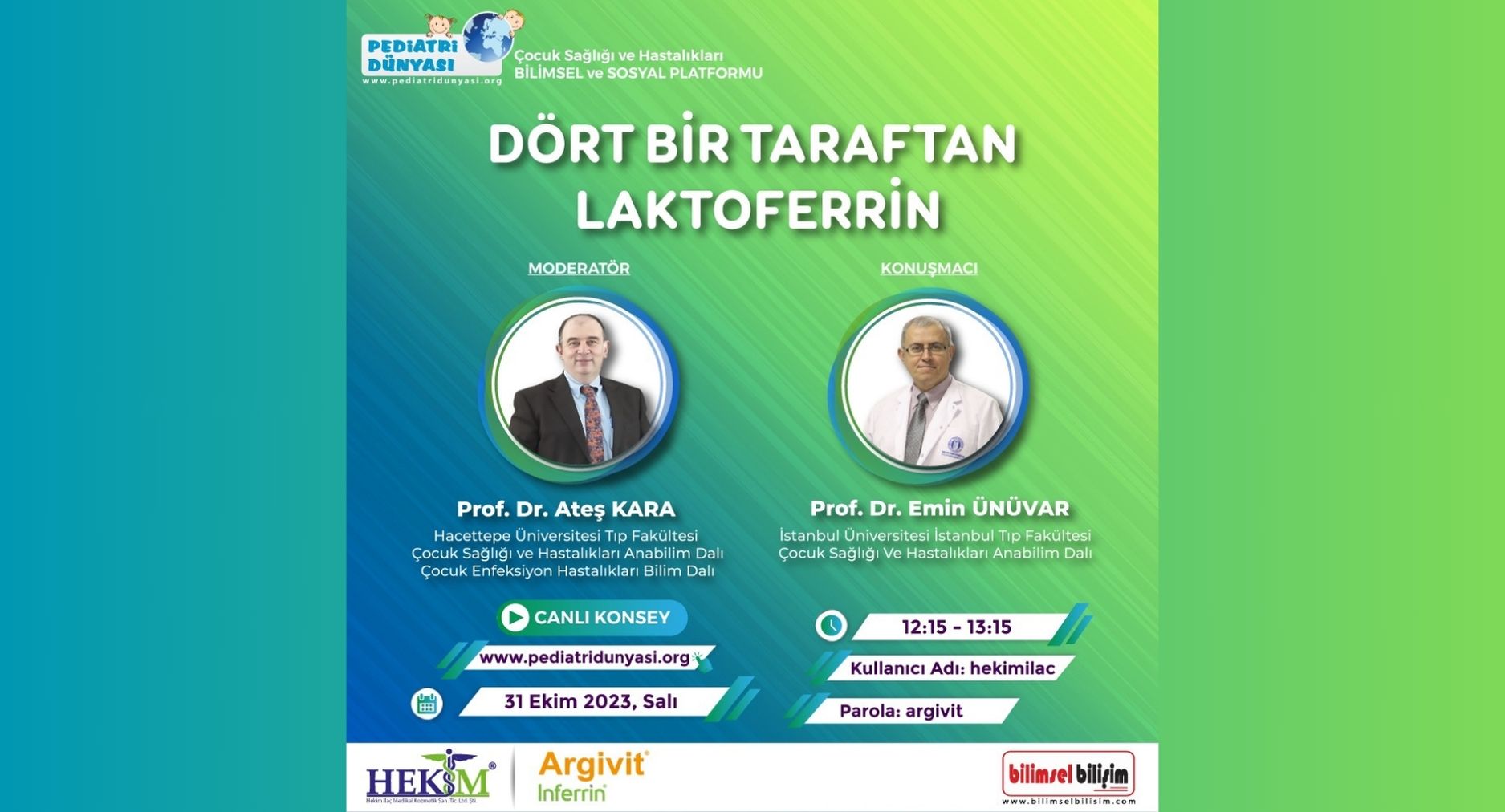 Prof. Dr. Emin ÜNÜVAR'ın konuk olduğunu, modarotörlüğünü Prof. Dr. Ates KARA'nın yaptığı DÖRT BIR TARAFTAN LAKTOFERRiN konu başlıklı webinar 31 Ekim 2023 tarihinde saat 12:15 - 13:15' de