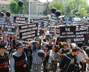 Tepe Natilıus'ta toplanan yaklşaşık 600 kişilik grup, "Hükümet elini eczanemizden çek", "İlaçta reklama hayır", "Herkese eşit parasız sağlık" sloganları atarak ve düdük çalarak alkışlar eşliğinde Kadıköy İskele Meydanı'na yürüdü.