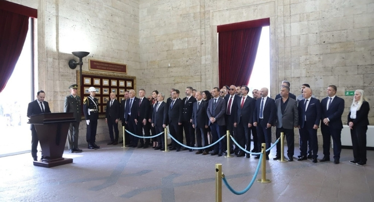 Saygı geçişinin ardından Başkan Ersan, meslektaşları adına kırmızı beyaz karanfillerden oluşan ay yıldızlı çelengi Atatürk’ün mozolesine sundu.