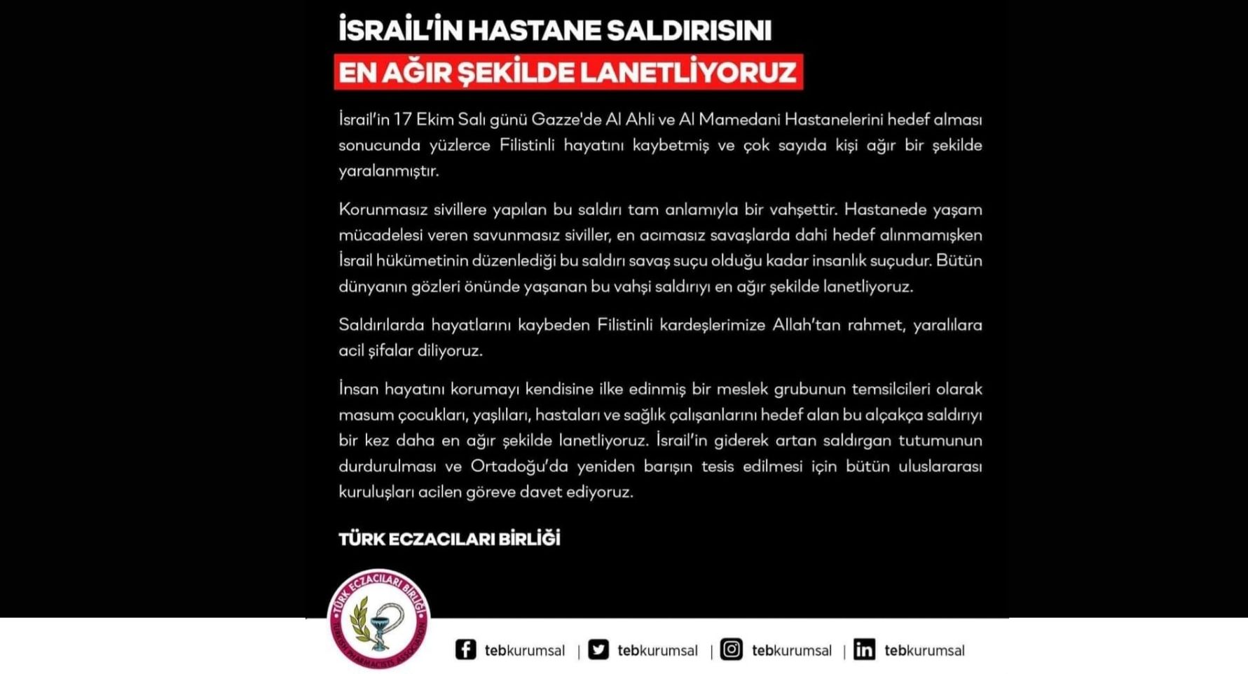 İnsan hayatını korumayı kendisine ilke edinmiş bir meslek grubunun temsilcileri olarak masum çocukları, yaşlıları, hastaları ve sağlık çalışanlarını hedef alan bu alçakça saldırıyı bir kez daha en ağır şekilde lanetliyoruz. İsrail’in giderek artan saldırgan tutumunun durdurulması ve Ortadoğu’da yeniden barışın tesis edilmesi için bütün uluslararası kuruluşları acilen göreve davet ediyoruz.