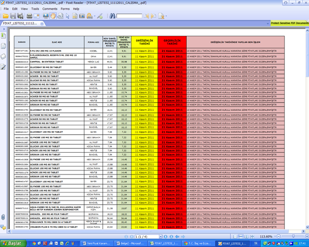 11.11.2011 tarihinde İlaç Eczacılık Genel Müdürlüğünün Resmi İnternet sitesinde yayımlanan Yeni Fiyat Kararnamesine Göre Belirlenen Fiyatlar başlıklı duyuru da,
