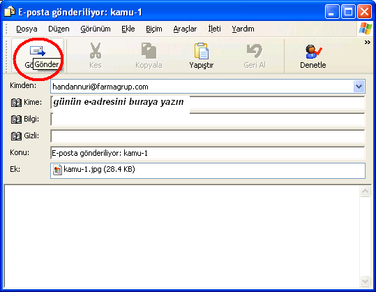 Aşağıda yer alan e-ilan kutusunun sol üst köşesinde dolaştığınızda çıkacak menüde “Bu resmi e-postayla gönder” seçeneği ile oluşacak yeni ileti penceresine bugünün adresini (her güne yeni bir adres) yazarak gönder tuşunu tıklayıp,