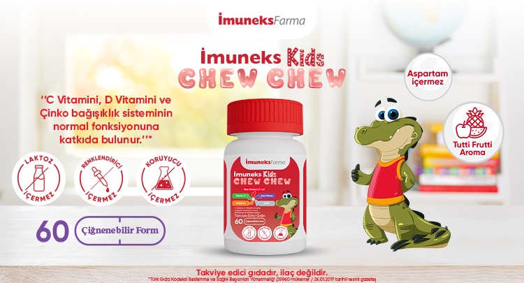 İmuneks Kids Chew Chew Beta Glukan (1/3,1/6), Kara Mürver (Sambucus nigra) meyve ekstresi, Vitamin C, Vitamin D ve Çinko içerir.