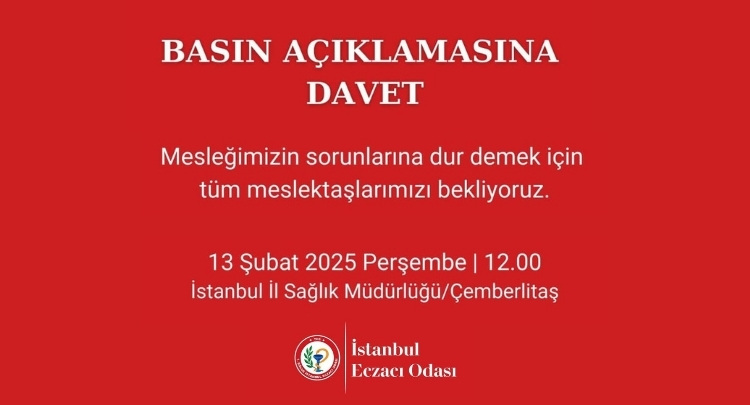 İlaç ve eczacılık hizmetlerine yalnızca tasarruf kalemi olarak bakan, bugün hem eczacıyı hem vatandaşı mağdur eden sağlık politikalarına dur demek için 13 Şubat Perşembe günü saat 12.00'de, İstanbul İl Sağlık Müdürlüğü önünde bir basın açıklaması gerçekleştirilecektir.