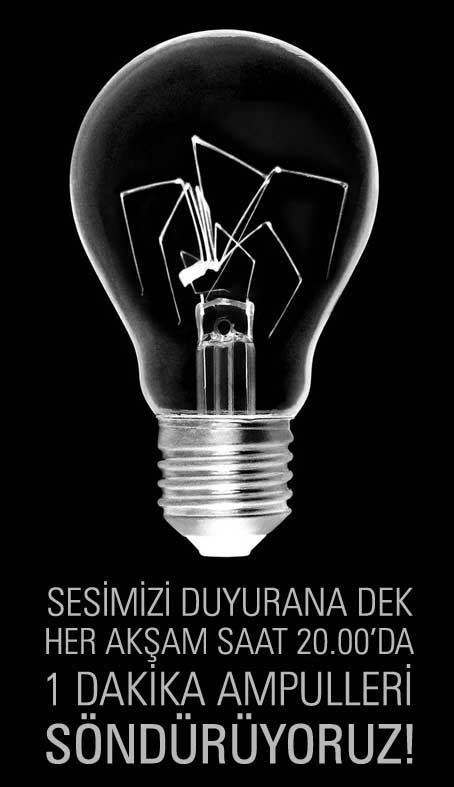 Cumhuriyetine sahip çık Tandoğan ve Çağlayan mitinglerine gidenler sadece bir kısmımızdı , gidemeyip yüreğiyle destek olanlar , ne kadar büyük olduğumuzu göstermek için bu akşamdan itibaren hergün sesimizi duyurana dek saat 20.00'de 1 dakika AMPULLERİ SÖNDÜRÜYORUZ..