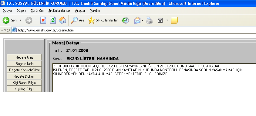 Sistem Mesajı: "21.01.2008 tarihinden geçerli Ek-2D Listesi yayınlandığı için 21.01.2008 günü (Bugün) saat 11:00’a kadar işlenen reçete tarihi 21.01.2008 olan kayıtların Kurum’da kontrolü esnasında sorun yaşanmaması için silinerek yeniden kayıda alınması gerekmektedir."
