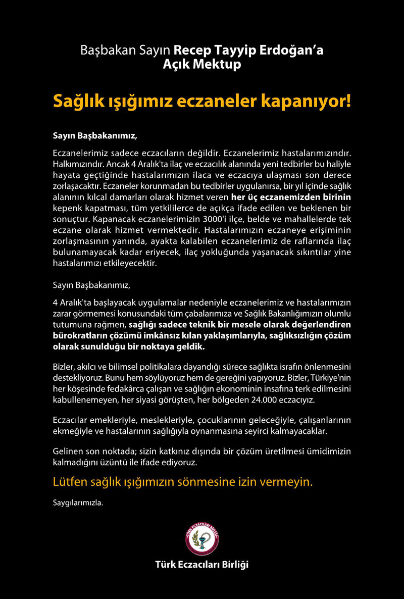 Aşağıda TEB' in basında Başbakan' a açık mektup şeklinde çıkacak ilanını yayınlıyoruz.