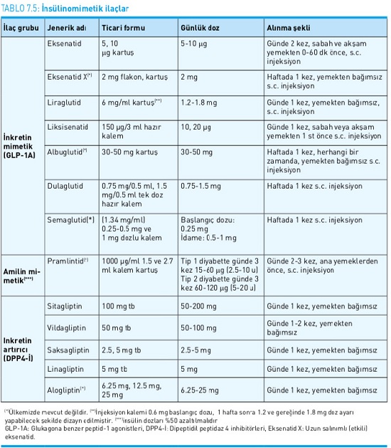 · Diyabet tedavisinde kullanılan Metglinid, DPP4 inhibitörleri, GLP1 reseptör agonistleri ile hipoglisemi riski ve henüz yapılan araştırmaların yetersiz olması dolayısı ile kullanımı önerilmez.