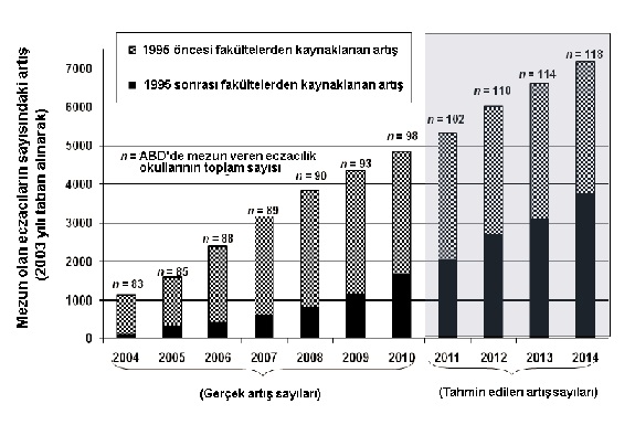 Şekil 1: ABD’de on yılda eczacılık okullarından mezun olanların sayısındaki hızlı artış eğilimi (Chow, M., Maine, L., Sagraves, R. Pharmacy education experience in the U.S.A. implications for Asia. JAASP 2012;1(2):68-77)